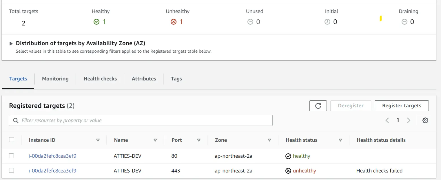 Register targets에서 443 port를 지워줘서 해결해줬다.