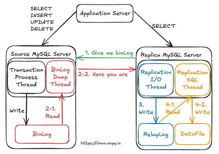 좀 더 디테일하게 동기화 과정을 알아보자면, 1) 바이너리 로그 덤프 스레드 2) 레플리케이션 I/O 스레드 3) 레플리케이션 SQL 스레드 로 총 세 스레드로 나눠 살펴볼 수 있다. 과정을 순서대로 정리해 보면 아래와 같다.