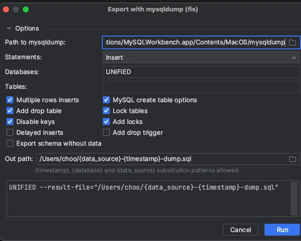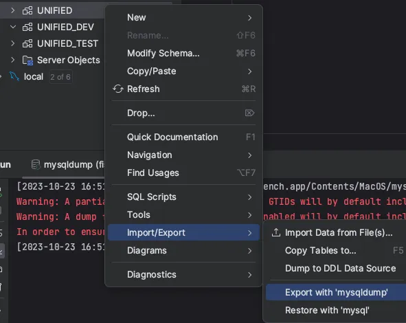 데이터그립에서 원하는 스키마 혹은 테이블의 오른쪽 클릭 > Import/Export > Export with mysqldump 클릭