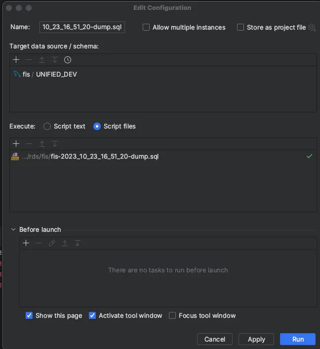 데이터그립에서 dump.sql 파일 오른쪽 클릭해서 Run 클릭 (실행 시 스키마 지정해주기)