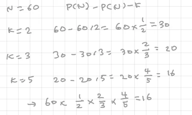 K=5일 때 20-20/5=16로 60의 서로소 후보 중 5의 배수들인 12개가 아닌 4개가 제거됨. 나머지 8개는 2와 3의 배수에서 미리 제거됐음.
