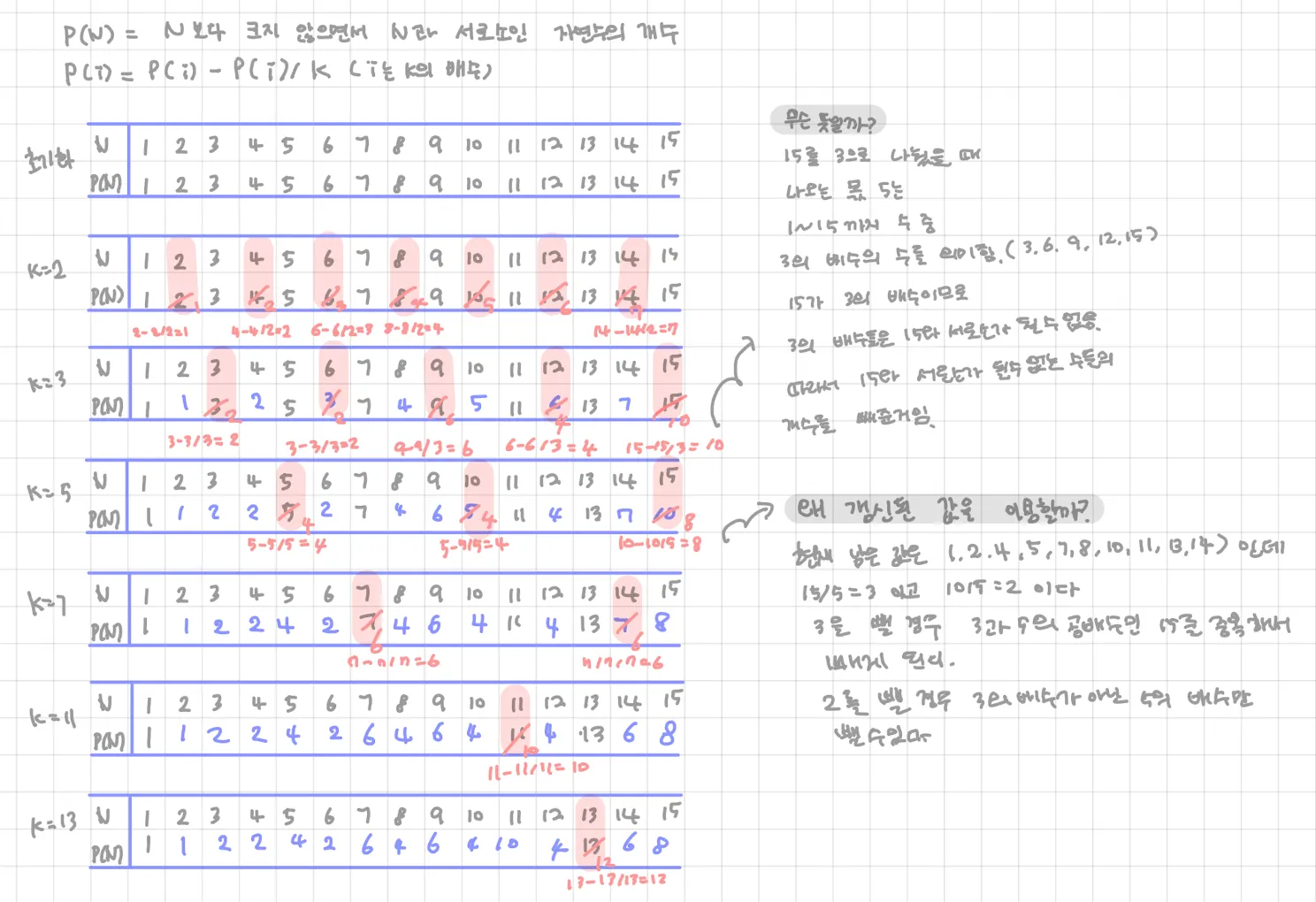 예를 들어 N=12는 K=2, K=3(12의 소인수 : 2, 3)일 때 P(i)-P(i)/K 연산을 진행했음을 위 그림에서 확인할 수 있음