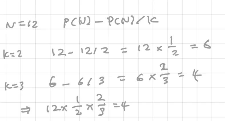 K=2일 때 N=12가 K로 나누어 떨어지기에 P(i)-P(i)/k 연산을 수행하면 12-12/2=6으로 납득이 쉽지만