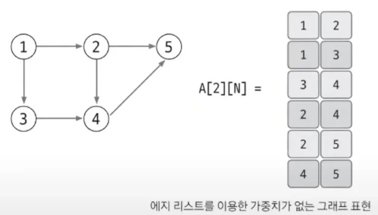 에지를 중심으로 표현하다보니, 노드로 탐색하긴 어려움 (노드 중심 알고리즘에 잘 사용안함)