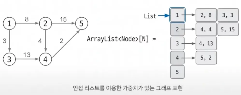 (도착 노드, 가중치)를 갖는 Node 클래스를 선언해 ArrayList에 사용