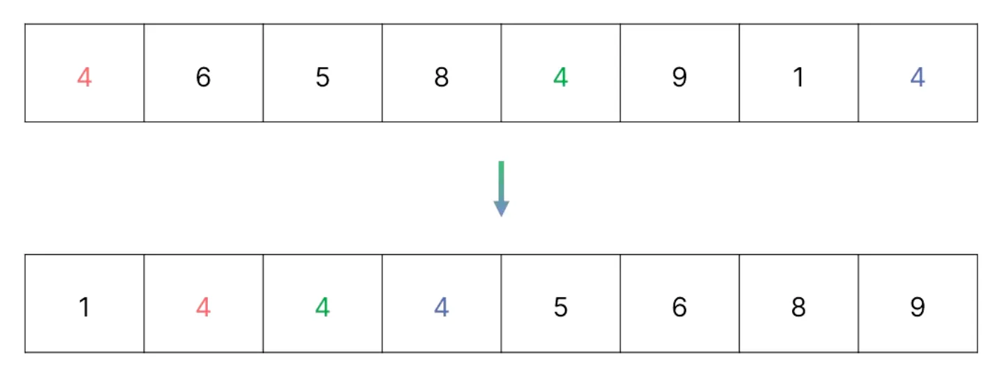 불안정 정렬(Unstable Sort) : 동일한 값들이 정렬 후 순서가 바뀜