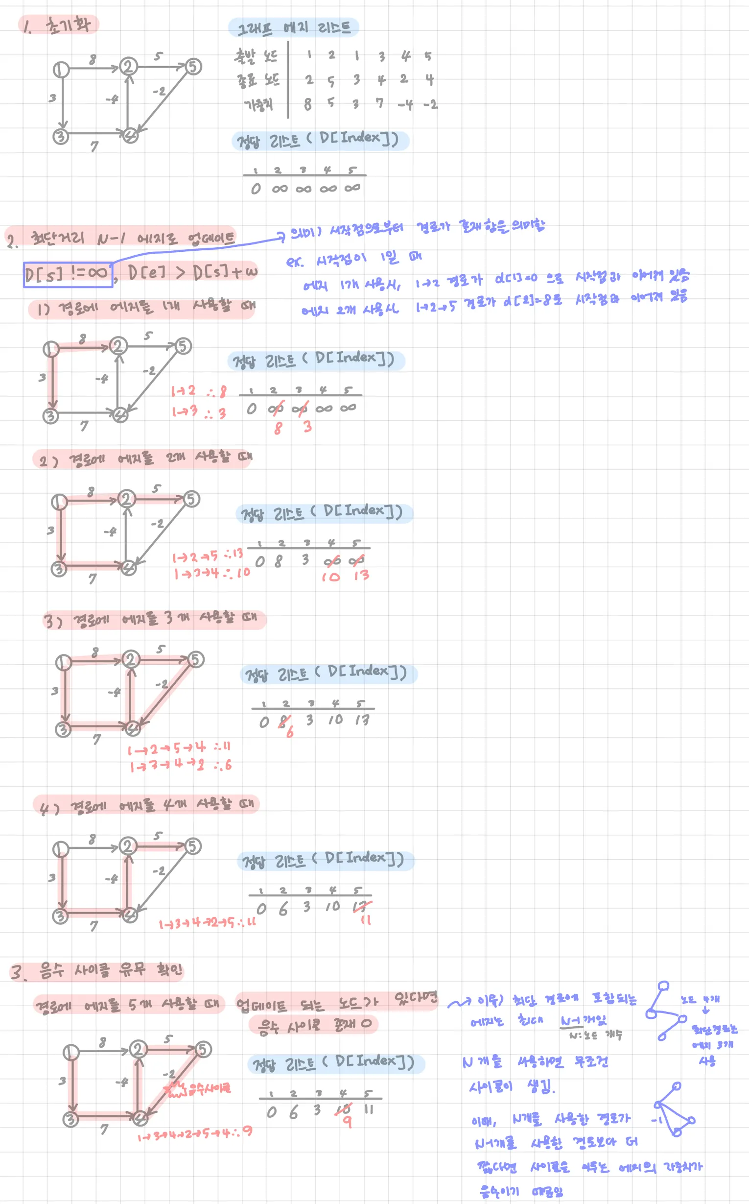 모든 에지를 한 번씩 다시 사용해 업데이트되는 노드가 발생하면 음수 사이클이 있단 의미