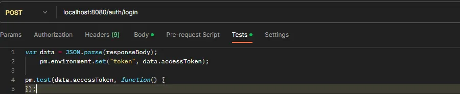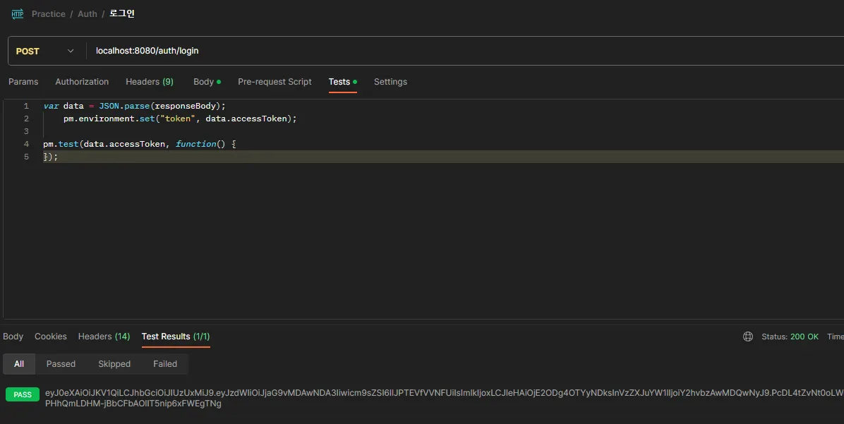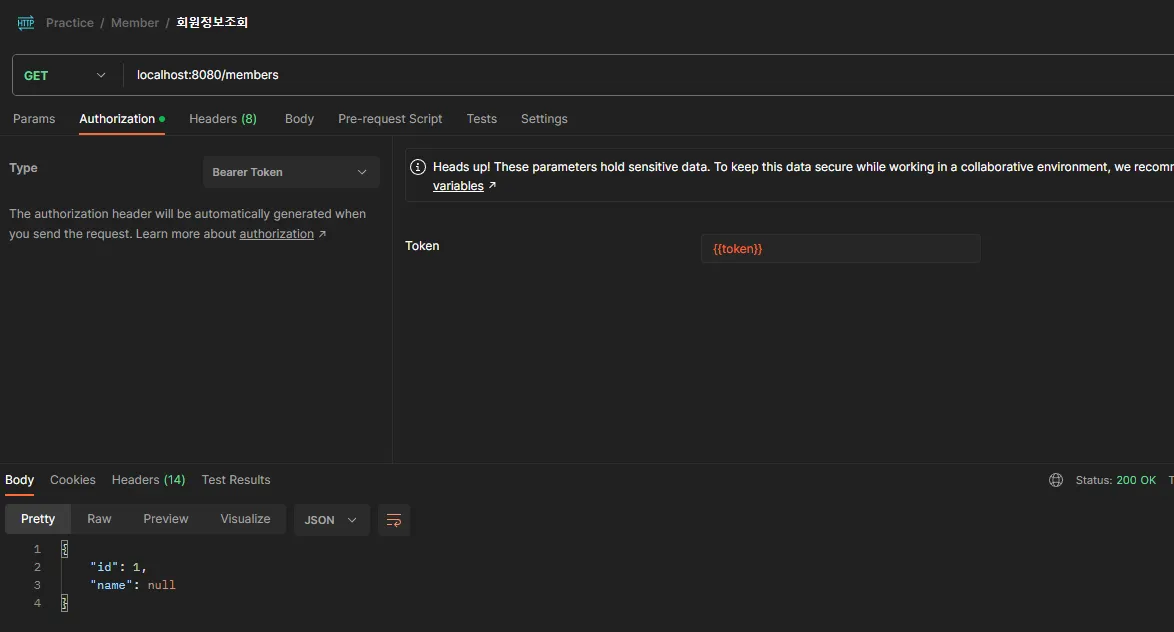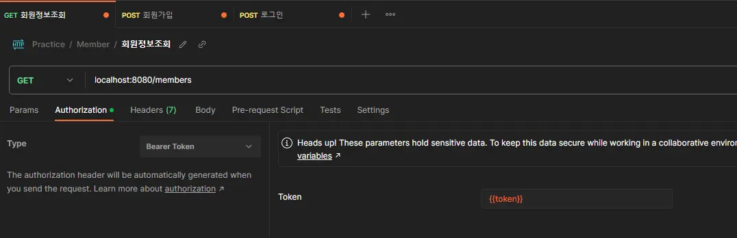 예를 들면 회원정보조회와 같은 API에 Authorization 값으로 방금 생성한 환경변수 token을 넣어줌