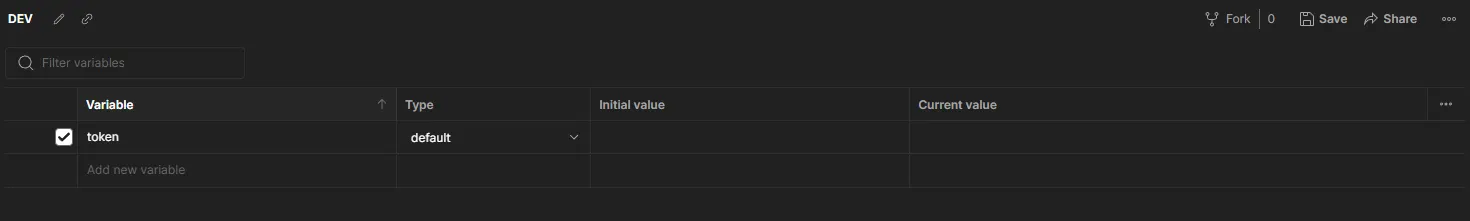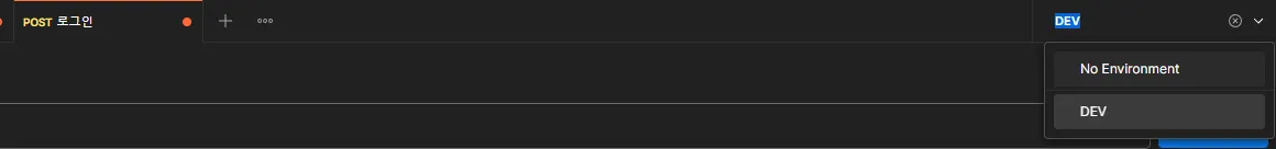 설정 끝. 이제 다시 API 테스트하는 화면으로 돌아와서 우측 상단에 No Envrionment를 방금 만든 DEV로 바꿔주기 (매우매우매우매우매우매우 중요. 이거 까먹고 안된다 하는 사람들 많음.. 매번 페이지 다시 들어갈 때마다 해주어야 하니 혹시 포스트맨으로 인증 테스트가 잘 안된다면 No environment로 되어 있지 않은지 항상 확인하자.)
