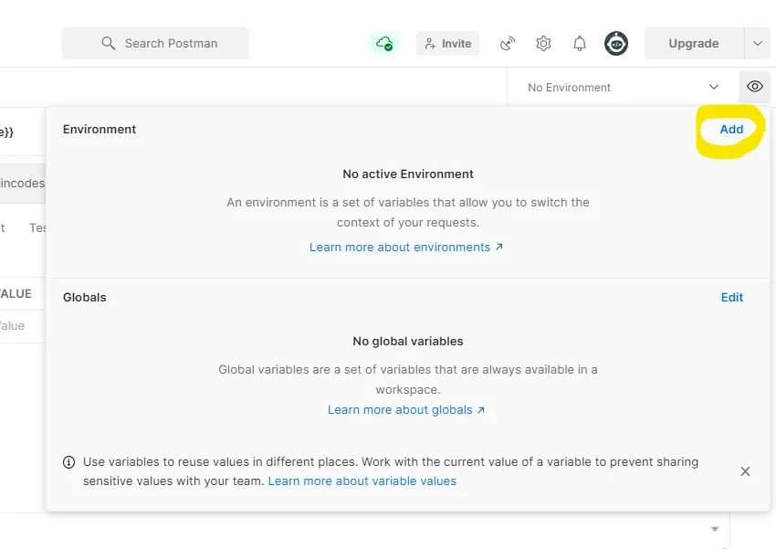우측 상단에 빨간색으로 표시된 부분 클릭 후 environment에 Add 클릭