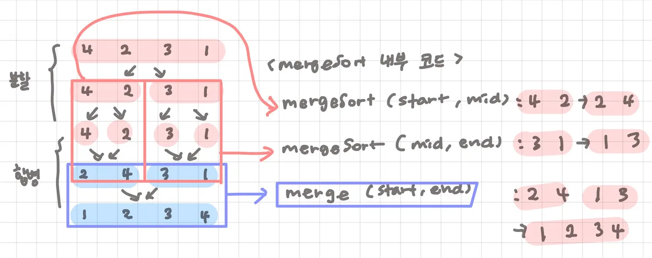정의) 분할정복 방식 사용해 데이터를 분할하고 분할한 집합을 정렬하며 합치는 알고리즘