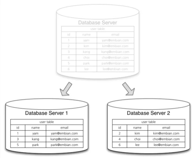 ํ๋์ ์๋ฒ์ ํ๋์ Database๋ฅผ ๋๋๋ ์ฌ์ฉ์๊ฐ ๋ง์์ก์ ๋ Database๊ฐ ๋ง์ Query๋ฅผ ์ฒ๋ฆฌํ๊ธฐ ํ๋ ์ํฉ์ด ์ด.