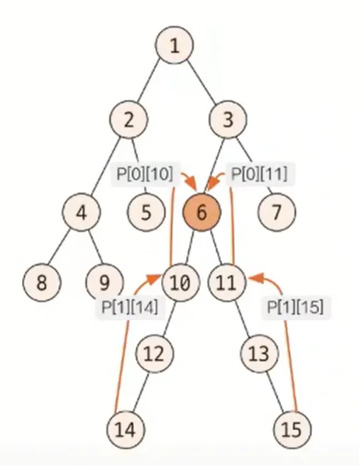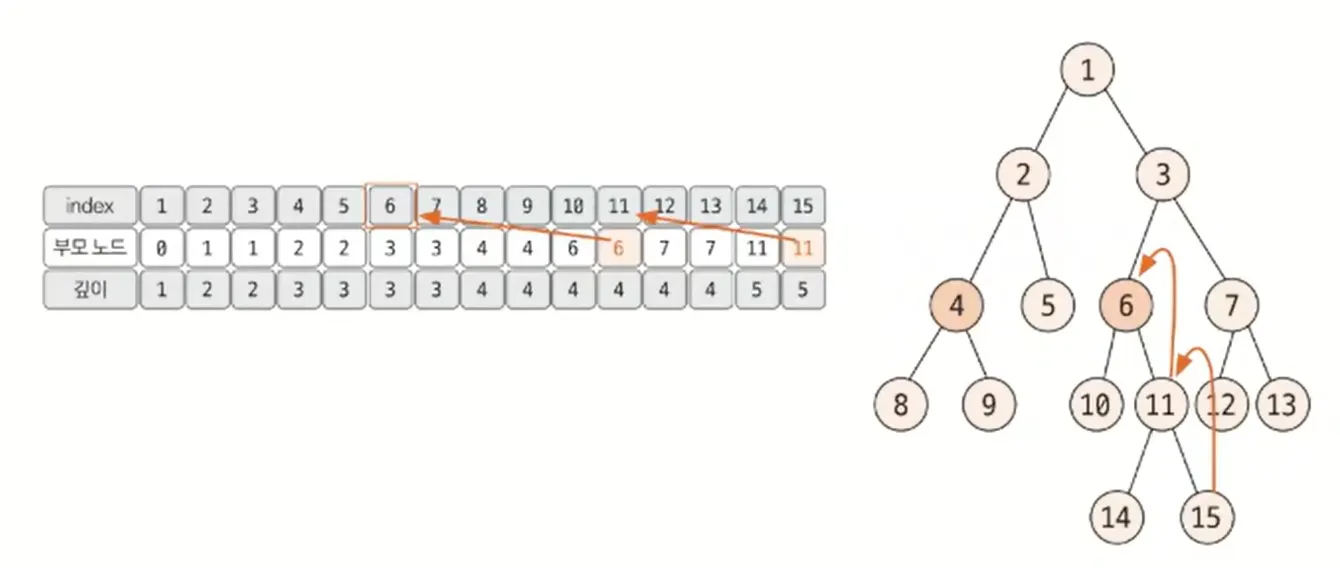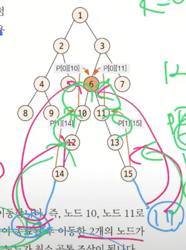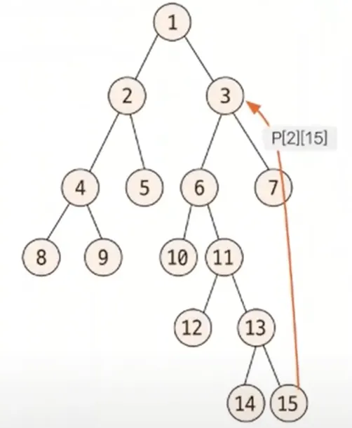 부모: P[2][15] 로 찾아감 (15의 4번째 부모 노드)