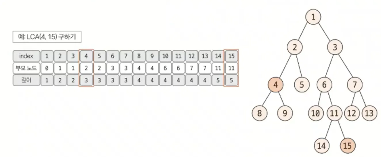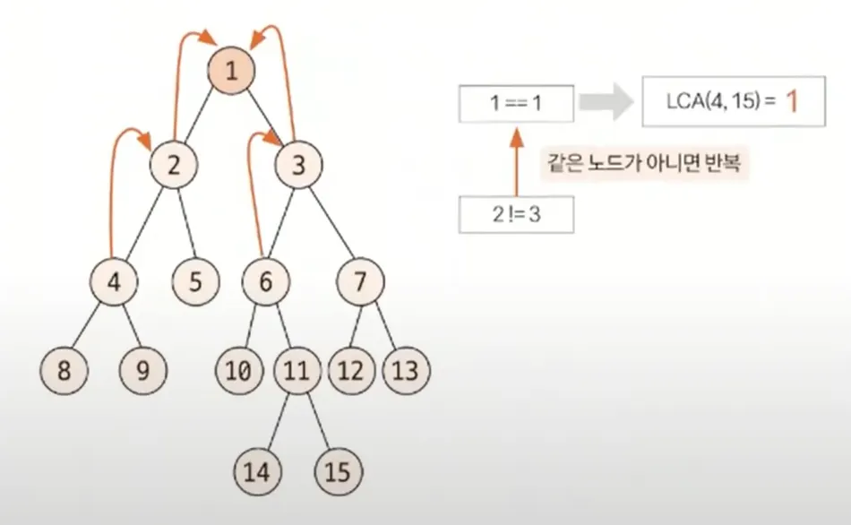 ex) 3과 15 노드라면, 3에서 깊이가 같아지고 두 노드가 같기에 최소공통조상은 3