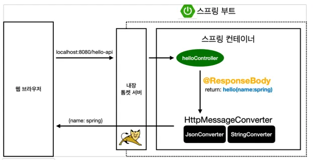스프링은 Controller에 보니 hello-api가 존재함. 근데, ResponseBody라는 annotation이 붙어있음.