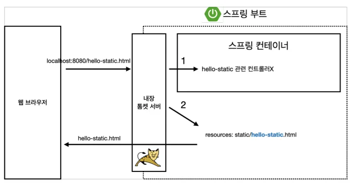 내장 톰캣 서버가 요청을 받아 hello-static.html 왔다고 스프링한테 넘김