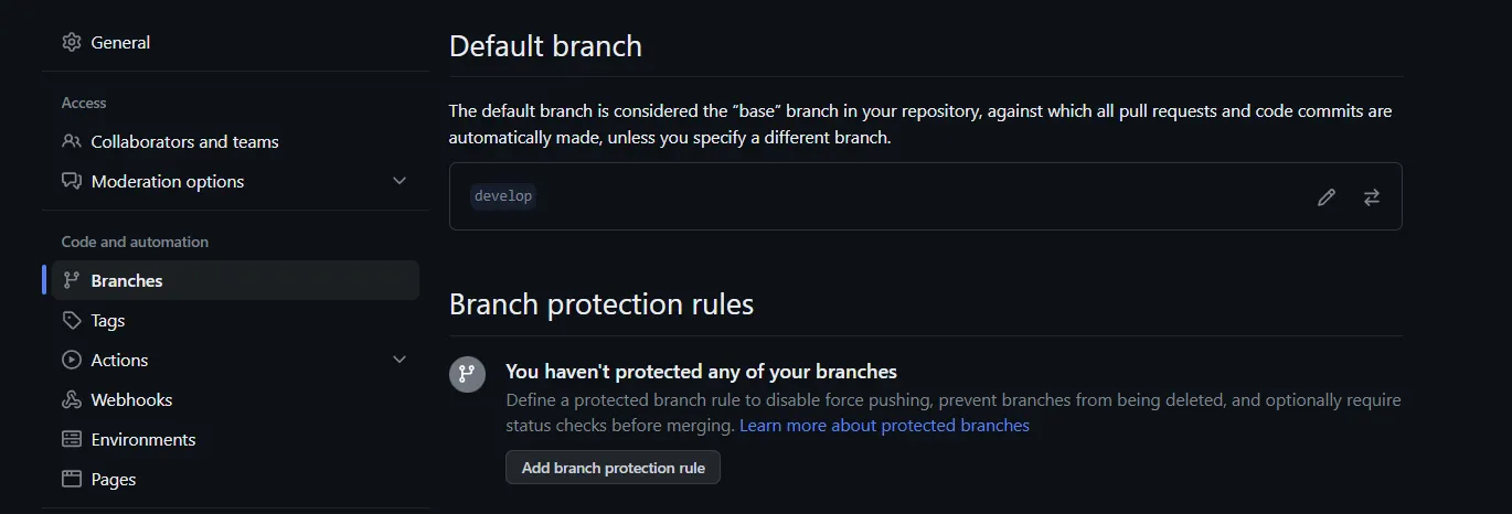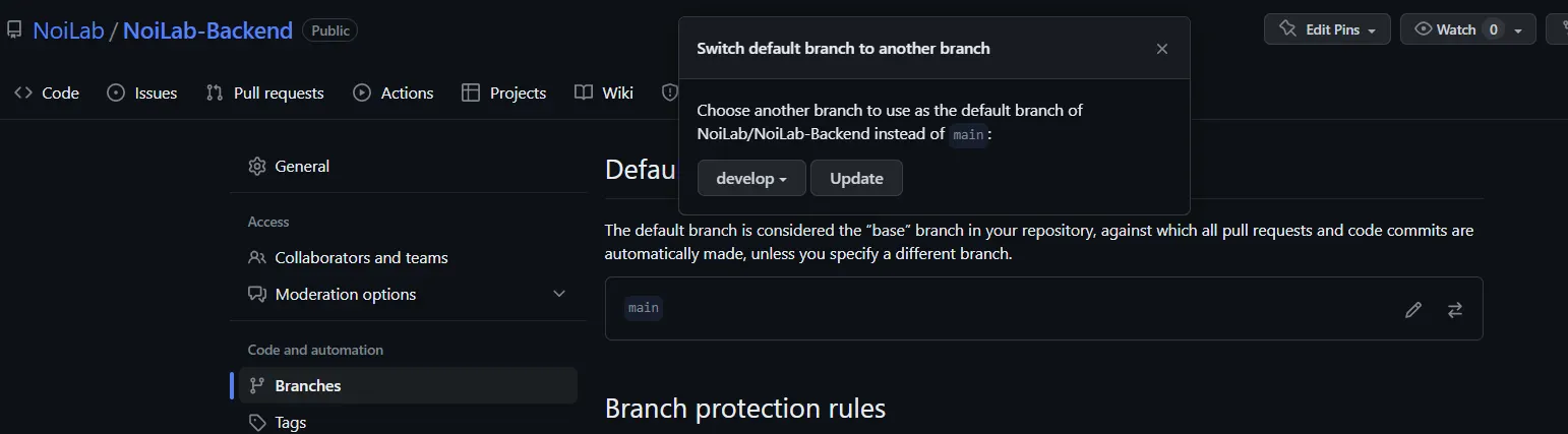 develop 브랜치 생성하고, default로 지정