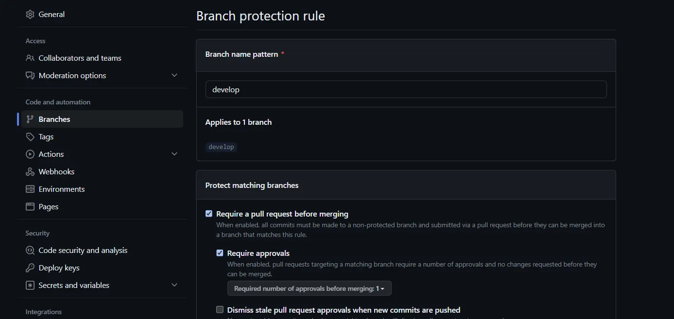 branch protection rule 추가 (리뷰 한 개 이상 달려야 머지할 수 있게 설정하는 건 체크 해제함. 1인 개발이라,,)