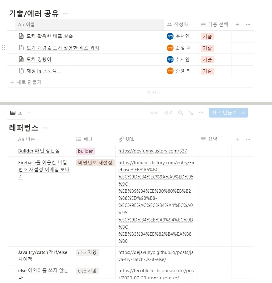 레퍼런스, 기술/에러 공유 페이지가 있는데 팀원들과 함께 열심히 작성했습니다! 레퍼런스는 사진에 보이시는 것 외에도 훨씬 더 많이 있는데 캡처하기 힘들어서 저만큼만 가져왔습니다,,,