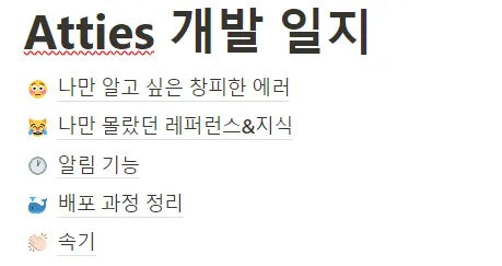 사실 이외에도 제 개인 노션에 정리해둔 레퍼런스, 기술/에러 기록 페이지가 있습니다,,, 공통 팀 노션에 올리기엔 너무 기초적인 지식들일 거 같아 (남용하는 거 같기도 하고, 부끄럽기도 해서요,,,) 따로 정리해뒀습니다,, 제 비밀 페이지인데 여기에라도 슬며시 올려보겠습니다,,