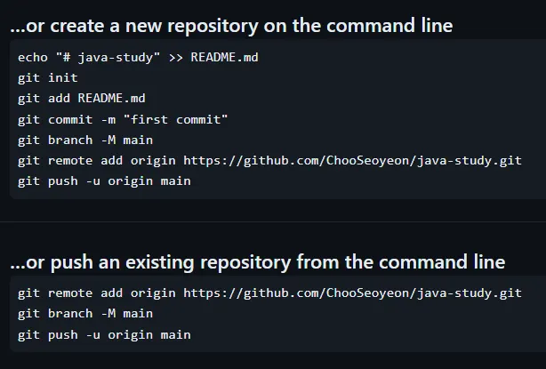 remote 리포지토리 생성 후 아래 명령어를 입력하라고 뜬다. 그 의미를 먼저 살펴보자