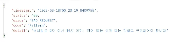 "trace": "org.springframework.validation.BindException: org.springframework.validation.BeanPropertyBindingResult: 1 errors\nField error in object 'memberUpdateRequest' on field 'nickname': rejected value [안녕fasㅇㅇ]; codes [Pattern.memberUpdateRequest.nickname,Pattern.nickname,Pattern.java.lang.String,Pattern]; arguments [org.springframework.context.support.DefaultMessageSourceResolvable: codes [memberUpdateRequest.nickname,nickname]; arguments []; default message [nickname],[Ljavax.validation.constraints.Pattern$Flag;@23e15ece,^(?=.*[a-z0-9가-힣])[a-z0-9가-힣]{2,16}$]; default message [닉네임은 2자 이상 16자 이하, 영어 또는 숫자 또는 한글로 구성되어야 합니다]\r\n\tat org.springframework.web.method.annotation.ModelAttributeMethodProcessor.resolveArgumen