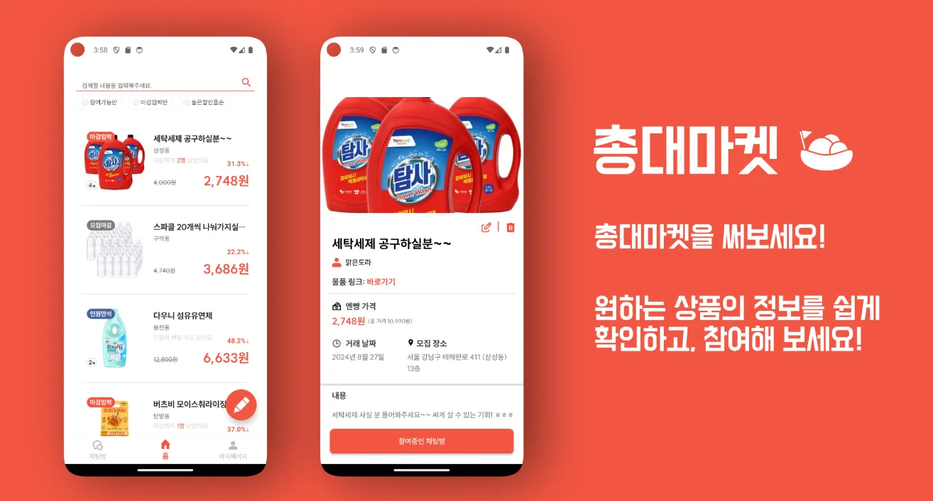 총대마켓은 지역 기반으로 공동구매에 관심 있는 사람들을 연결해, 원하는 물품을 대량 구매가 아닌 소량으로도 저렴하게 구입할 수 있도록 돕는 서비스입니다. 이를 통해 사용자는 비싼 배송비나 대량 구매의 부담 없이, 효율적이고 합리적인 소비를 할 수 있습니다.