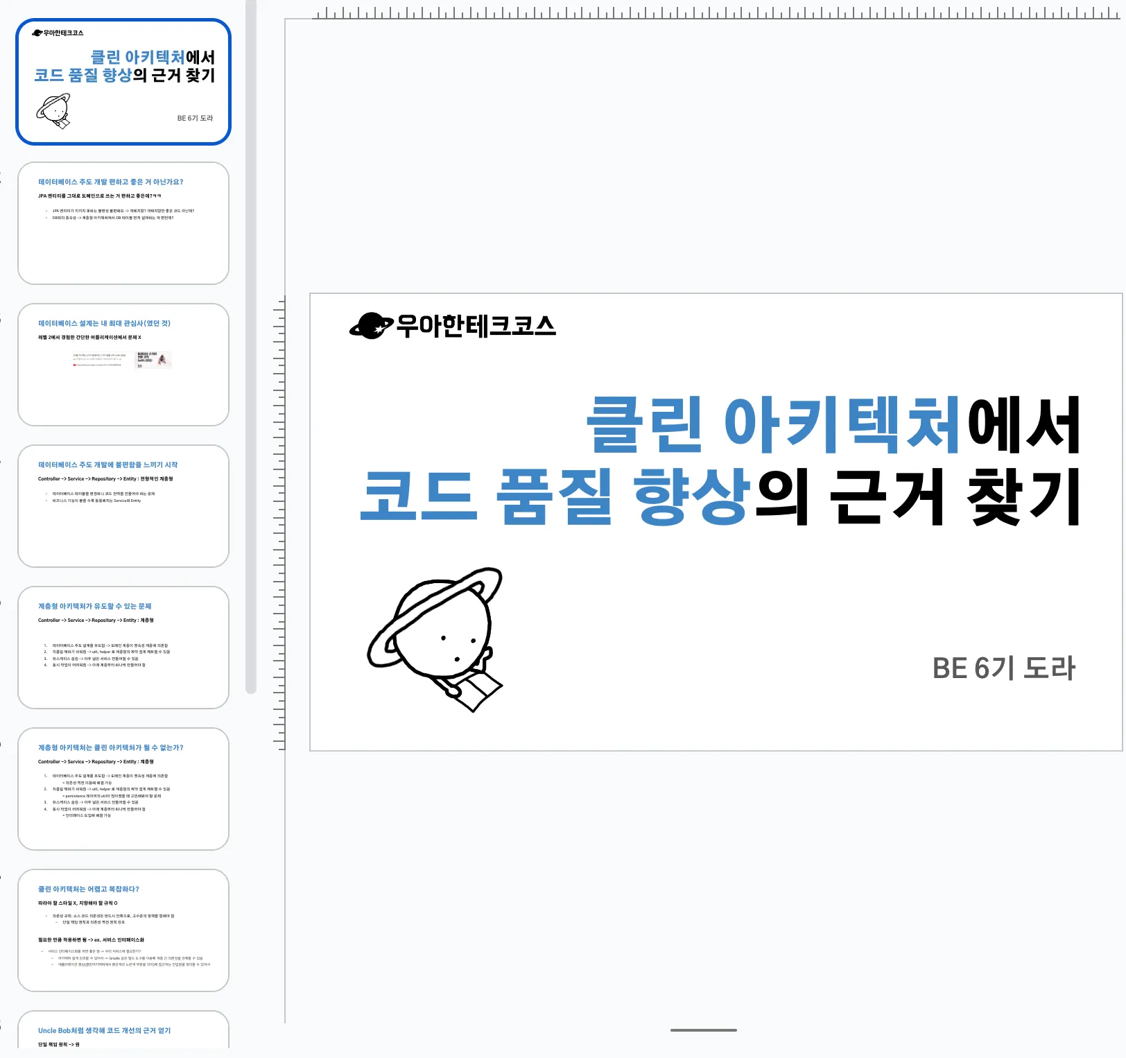 팀원들을 설득하기에 앞서, 클린 아키텍처의 규칙에 기반해 팀의 데이터베이스에 의존적인 코드를 리팩토링할 방법을 먼저 정리했습니다. 팀원들 뿐만 아니라 최대한 많은 개발자에게 이를 공유하고 싶은 욕구가 생겨, 우아한테크코스 내에서 자체적으로 발표 세션을 따로 열어 “클린 아키텍처에서 코드 품질 향상의 근거 찾기”라는 주제로 발표를 진행했습니다.