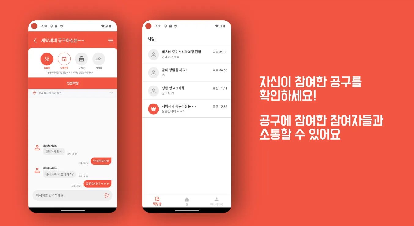 공동구매에 대한 수요를 조사하기 위해 앱 런칭 전 145명이 속한 우아한테크코스 슬랙 채널에서 총 10회에 걸쳐 공동구매를 진행했습니다. 이때 가격과 물건 정보가 불분명하게 인지되는 공동구매는 실패하는 걸 확인해, A/B 테스트를 통해 가격과 물건 정보가 확실하게 인지되는 UI를 만들었습니다. 앱이 런칭되고 효과적인 UI만으론 유저를 모을 수 없고, 결국엔 이벤트와 광고가 필요하단 점을 깨달았습니다.